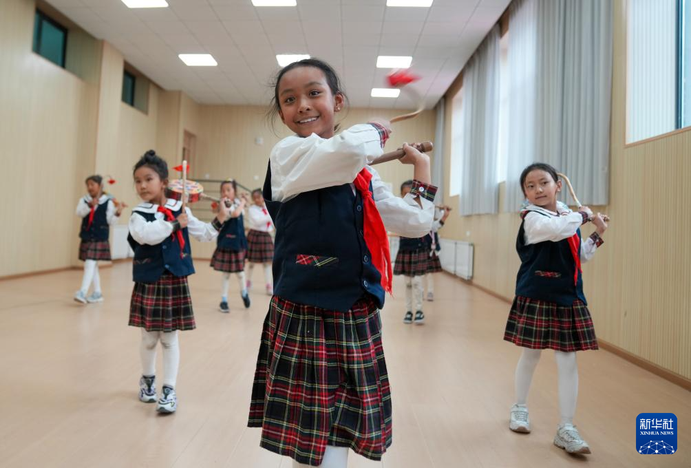 9月11日,在拉薩市實(shí)驗(yàn)小學(xué),孩子們?cè)诰毩?xí)熱巴舞。新華社記者 晉美多吉 攝