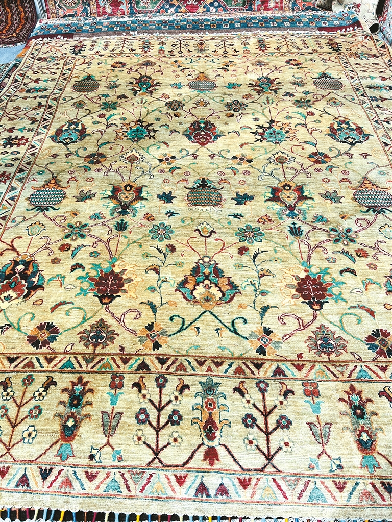 圖為外國(guó)商家展示阿富汗手工羊毛地毯。記者 央金 攝