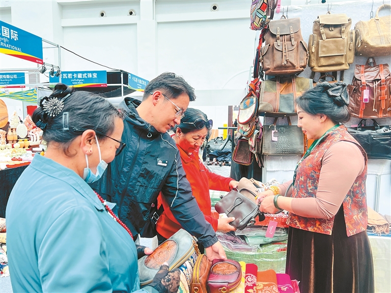 西藏本土特色產(chǎn)品同樣是展會(huì)的亮點(diǎn)。在非遺展區(qū),藝人們正向游客傳授唐卡選購(gòu)技巧;藏式食品銷售區(qū)更為熱鬧,工作人員為游客遞上酥油茶:“趁熱喝,配青稞餅更地道!”不少游客端碗坐在藏式卡墊上,一邊品嘗一邊交流,手中還拿著剛購(gòu)買的唐卡圖案布袋,神情喜悅。