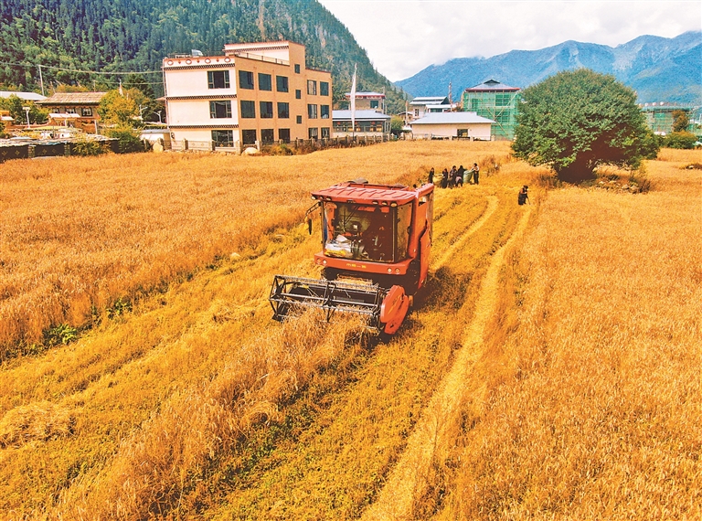 在拉薩市墨竹工卡縣唐加鄉(xiāng)莫沖村,田間地頭繁忙景象撲面而來。幾臺大型收割機(jī)轟鳴著在金色的農(nóng)田里來回穿梭,收割、脫粒一氣呵成,村民們跟在機(jī)器后方,有條不紊地進(jìn)行后續(xù)整理工作,呈現(xiàn)出一派熱火朝天的豐收場景。村民貢嘎頓玉向記者介紹,“我家共有37畝農(nóng)田,10畝種小油菜,27畝種青稞。以前全家4口上陣得忙上一個多月,現(xiàn)在有了機(jī)械化作業(yè),短短幾天就能完成所有秋收工作,既省時又省力?!?/p>