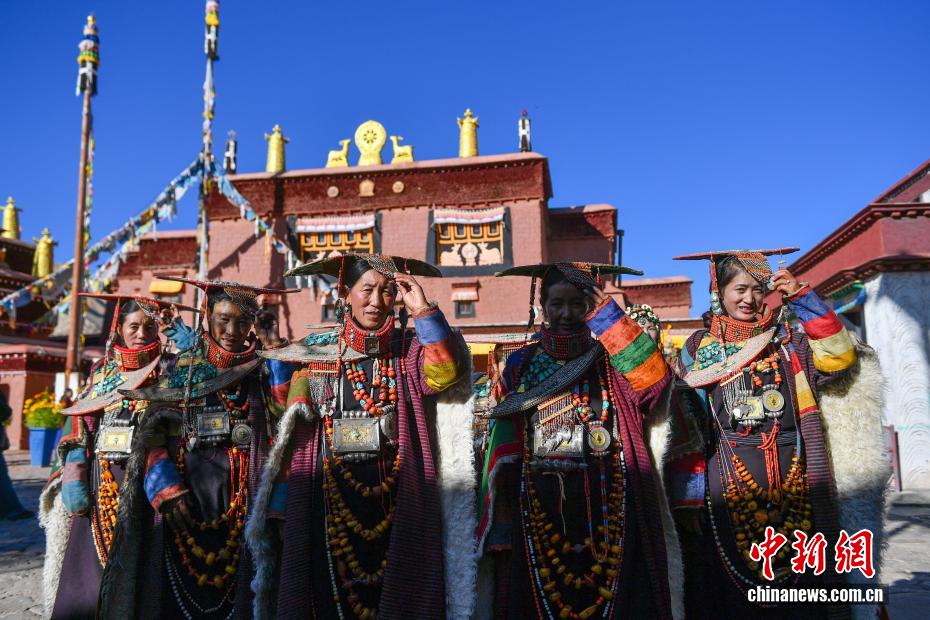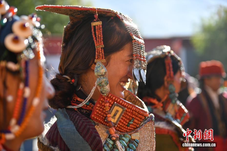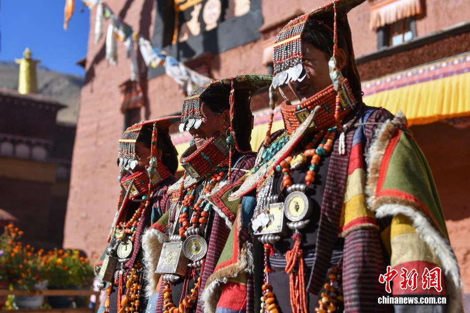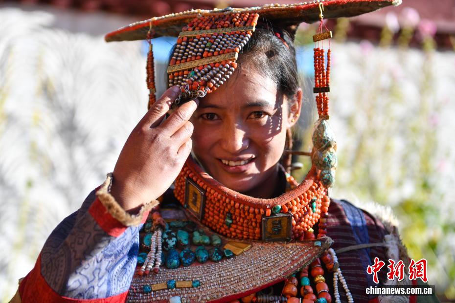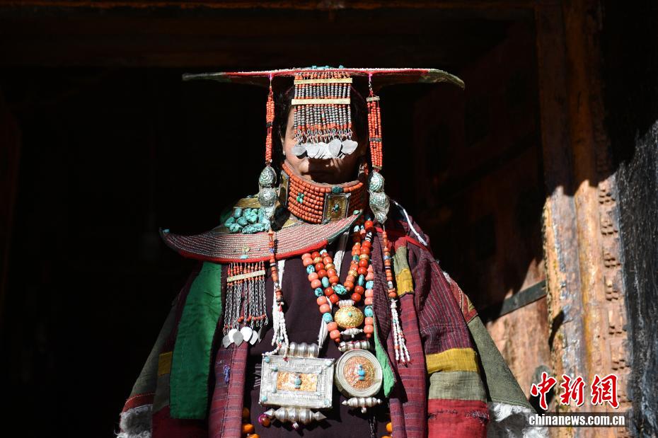 9月23日,西藏自治區(qū)阿里地區(qū)普蘭縣,至今保留著獨(dú)特的藏族服飾——普蘭服飾,它是中國國家級非物質(zhì)文化遺產(chǎn)。普蘭服飾已有1000多年的歷史,其中最精美、最獨(dú)特的是婦女的“孔雀服飾”,普蘭縣科迦村里有7戶人家保存著7套祖?zhèn)鞣?,一套重達(dá)20多公斤,裝飾有黃金、白銀、松石、瑪瑙、珊瑚、珍珠等,承載和沉淀了百年時光,堪稱“穿在身上的千年史”。時至今日,這種美麗的服飾文化還在當(dāng)?shù)貍鞒兄D為西藏阿里地區(qū)普蘭縣科迦村,村民在展示普蘭服飾。貢確 攝