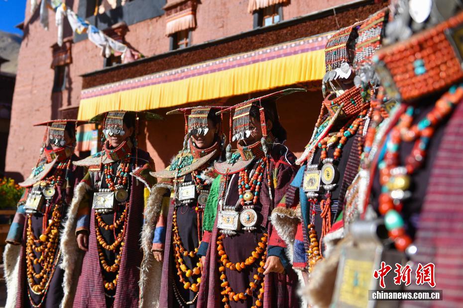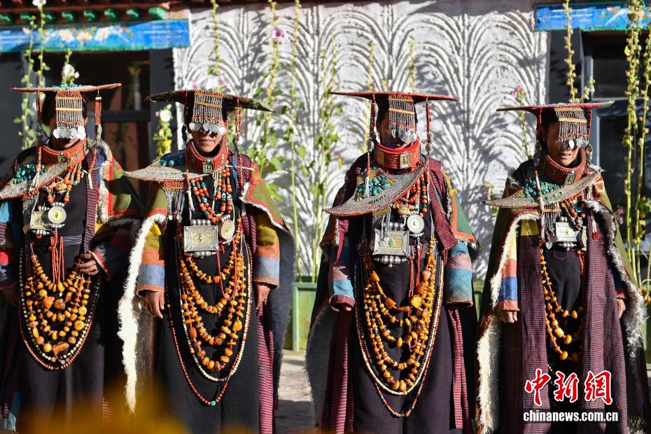 9月23日,西藏自治區(qū)阿里地區(qū)普蘭縣,至今保留著獨(dú)特的藏族服飾——普蘭服飾,它是中國國家級非物質(zhì)文化遺產(chǎn)。普蘭服飾已有1000多年的歷史,其中最精美、最獨(dú)特的是婦女的“孔雀服飾”,普蘭縣科迦村里有7戶人家保存著7套祖?zhèn)鞣棧惶字剡_(dá)20多公斤,裝飾有黃金、白銀、松石、瑪瑙、珊瑚、珍珠等,承載和沉淀了百年時光,堪稱“穿在身上的千年史”。時至今日,這種美麗的服飾文化還在當(dāng)?shù)貍鞒兄?。圖為西藏阿里地區(qū)普蘭縣科迦村,村民在展示普蘭服飾。貢確 攝
