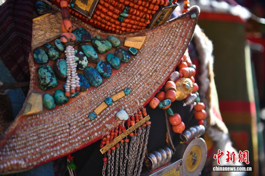9月23日,西藏自治區(qū)阿里地區(qū)普蘭縣,至今保留著獨(dú)特的藏族服飾——普蘭服飾,它是中國國家級非物質(zhì)文化遺產(chǎn)。普蘭服飾已有1000多年的歷史,其中最精美、最獨(dú)特的是婦女的“孔雀服飾”,普蘭縣科迦村里有7戶人家保存著7套祖?zhèn)鞣棧惶字剡_(dá)20多公斤,裝飾有黃金、白銀、松石、瑪瑙、珊瑚、珍珠等,承載和沉淀了百年時光,堪稱“穿在身上的千年史”。時至今日,這種美麗的服飾文化還在當(dāng)?shù)貍鞒兄?。圖為普蘭服飾細(xì)節(jié)展示。貢確 攝