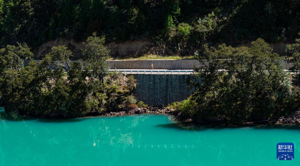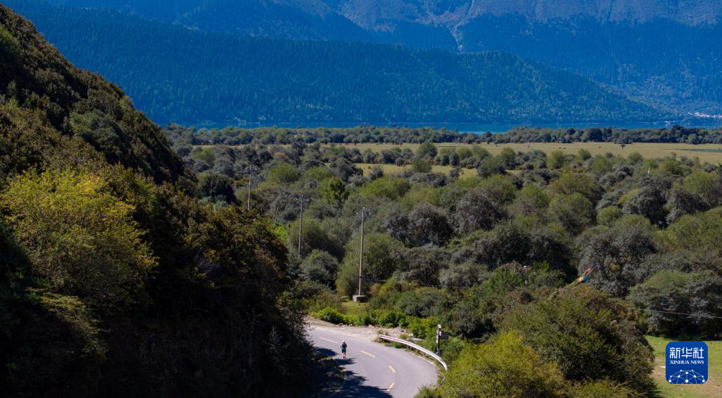 9月27日,參賽選手穿過巴松措濕地(無人機照片)。新華社記者 普布次仁 攝