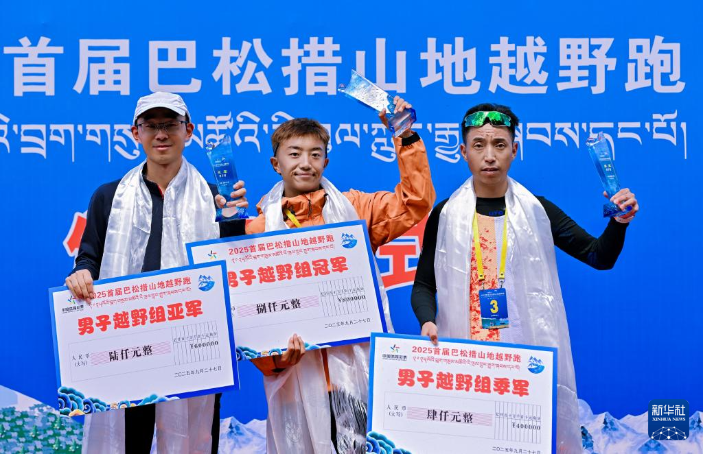 9月27日,30公里越野男子組冠軍桑珠(中)、亞軍侯華斌(左)和季軍普布頓珠在頒獎儀式上。新華社發(fā)