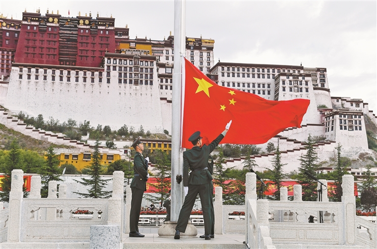 金秋十月舉國同慶,神州大地繁花似錦。10月1日上午,自治區(qū)慶祝中華人民共和國成立76周年“升國旗、唱國歌”儀式在布達(dá)拉宮廣場舉行。圖為儀式現(xiàn)場。記者 旦增蘭澤 攝