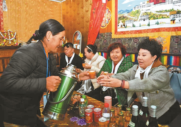 扎西曲登社區(qū)112號(hào)民宿主人為游客們倒酥油茶。記者 洛桑 唐斌 旦增蘭澤 攝