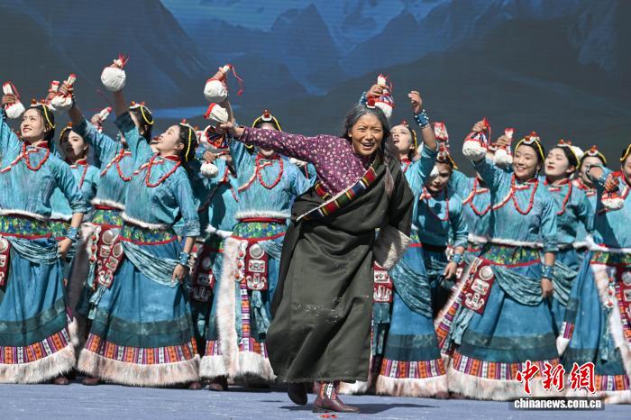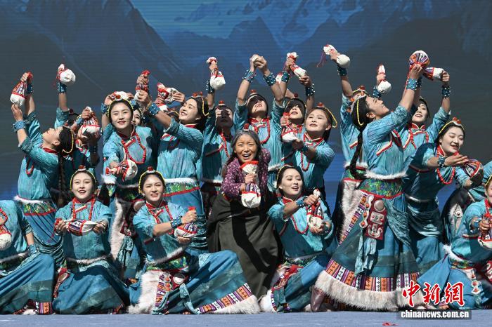 圖為阿里地區(qū)改則縣藝術(shù)團(tuán)表演舞蹈《歡舞幸?!じ膭t情》。中新社記者 貢嘎來松 攝