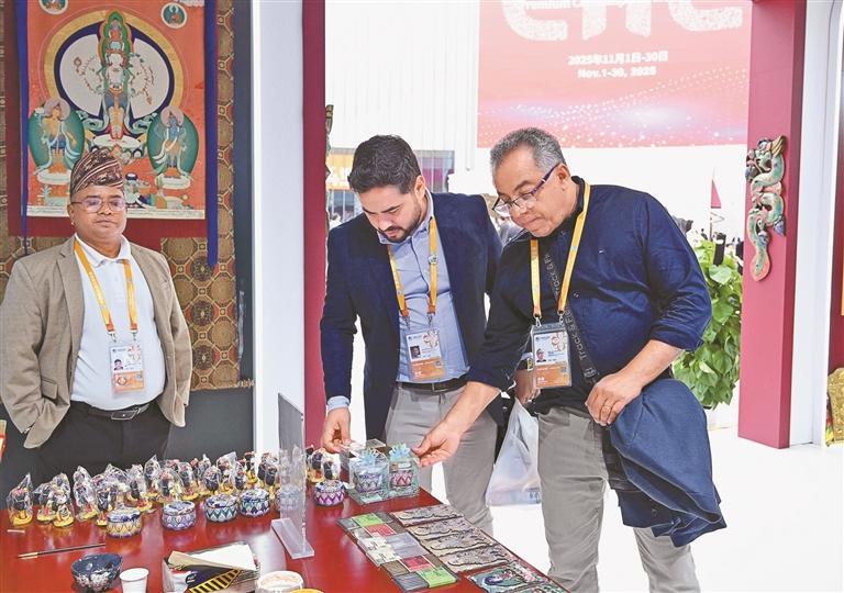 圖為第八屆中國國際進(jìn)口博覽會西藏館內(nèi)的客人在選購商品。記者 王敏 索朗瓊珠 嘎松卓瑪 攝影報(bào)道