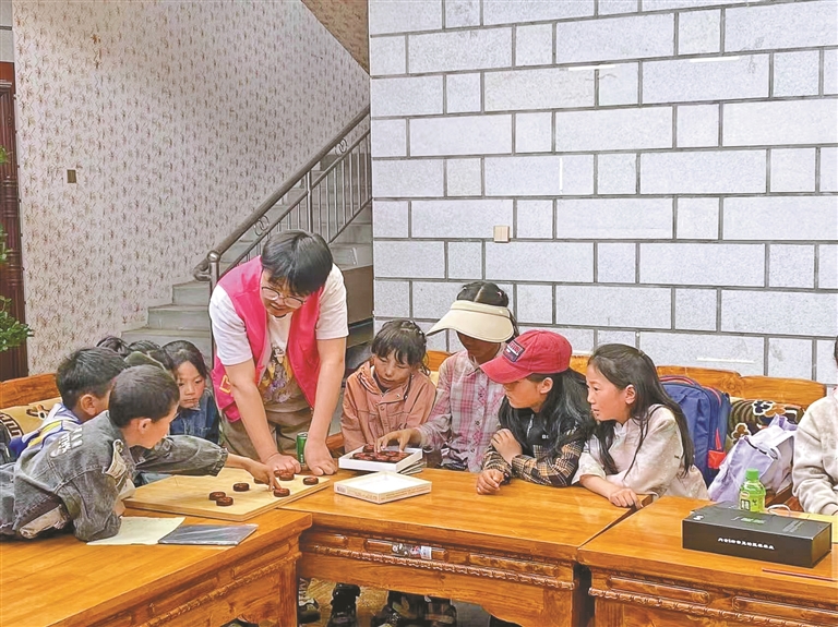 蔡公堂街道公堂社區(qū)開展的“小太陽”輔導(dǎo)班上,志愿者與孩子們下棋。