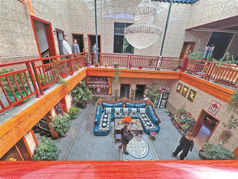 走進次仁措姆家院子里,她正在自家果園采摘剛成熟的石榴,房前的小院里整齊擺放著各種盆栽。“以前房前屋后雜物亂堆,經(jīng)過整治,空出的地方種上了蔬果,現(xiàn)在家家戶戶都有小果園,多虧了村里的整治行動?!贝稳蚀肽奉I(lǐng)著我們到客廳,指著墻上的“美麗庭院”流動紅旗笑著說:“這面旗是上個月評上的,現(xiàn)在村里都比著搞衛(wèi)生,誰也不想落后?!?/p>