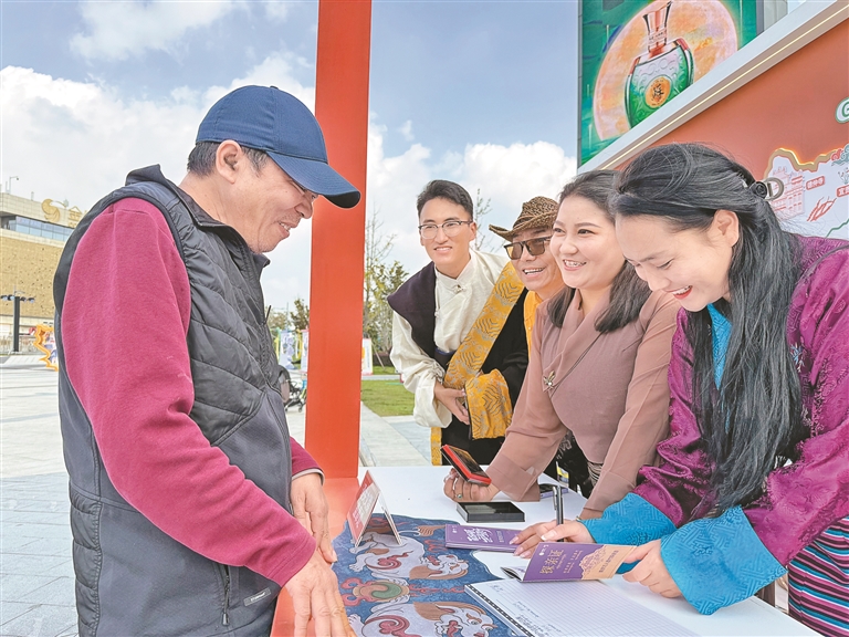 “萬人墨竹探親游”活動的探親證發(fā)放處人潮擁擠,排隊申請領證的市民絡繹不絕?!拔覀儨蕚淞?萬本免費發(fā)放的探親證,探親證上詳細介紹了紅色文化游、藍色康養(yǎng)游、綠色生態(tài)游、文化探秘游、墨竹深度游精品線路的詳細內容供大家選擇。屆時,我們將準備好香甜的青稞酒、潔白的哈達、美味的藏餐等候咱們南京的兄弟姐妹回雪域高原的墨竹家中看看、坐坐?!蹦窆たh文化旅游公司負責人扎西措姆在探親證發(fā)放現場介紹道。