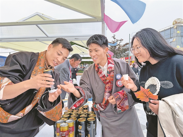 圖為南京市民在凈土產品展銷攤位前品嘗青稞酒。