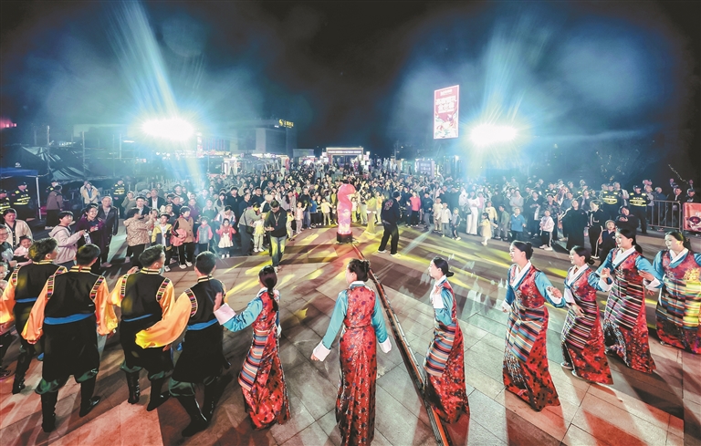 圖為萬人鍋莊晚會現場,南京市民與墨竹工卡縣松贊藝術團演職人員一起跳鍋莊。