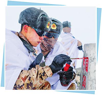 天色漸暗,山頂氣溫驟降,寒風(fēng)呼嘯。官兵們臉上沒(méi)有一絲畏懼,年輕的面龐更加堅(jiān)毅,互相鼓勵(lì)的聲音在隊(duì)伍中回蕩,“界碑不遠(yuǎn)了,再加把勁!”