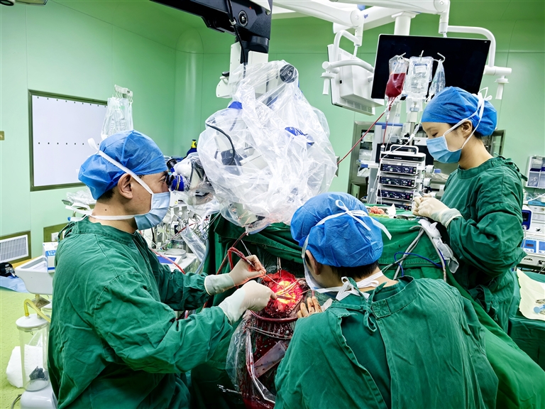 手術(shù)當(dāng)日,在麻醉科和手術(shù)室護(hù)士團(tuán)隊(duì)的密切配合下,由郝強(qiáng)主刀,單永炳、付永鵬擔(dān)任助手,為患者實(shí)施了手術(shù)。術(shù)中,郝強(qiáng)在顯微鏡下仔細(xì)分離腫瘤周邊的重要血管,最大程度保護(hù)周邊腦組織不受損傷,如同在生命禁區(qū)里仔細(xì)操作。術(shù)中一次性完整切除位于不同腦葉的3枚腫瘤,由于腦膜上散在多枚微小腦膜瘤,遂將侵犯腦膜一同切除。手術(shù)過程順利,患者恢復(fù)良好。術(shù)后復(fù)查頭顱MRI顯示,顱內(nèi)腫瘤已完全消失,無殘留。目前患者積極康復(fù)治療,將擇期出院。