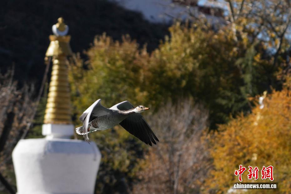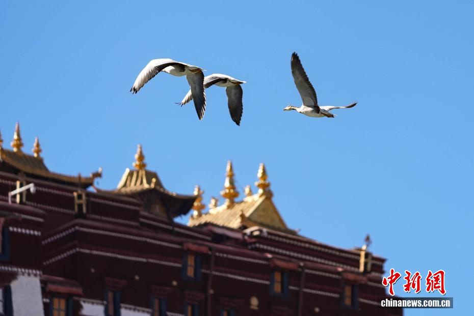 11月17日,西藏拉薩迎來(lái)大批越冬候鳥(niǎo)。拉薩河、宗角祿康公園等地,成為了它們的棲息天堂。在宗角祿康公園內(nèi),赤麻鴨、斑頭雁成群結(jié)隊(duì),時(shí)而低頭覓食,時(shí)而水中嬉戲。它們的身影引得市民和游客紛紛駐足觀賞、拍照留念,構(gòu)成了一幅人與自然和諧共生的美麗畫(huà)卷。圖為斑頭雁從宗角祿康公園上方飛過(guò)。貢確 攝