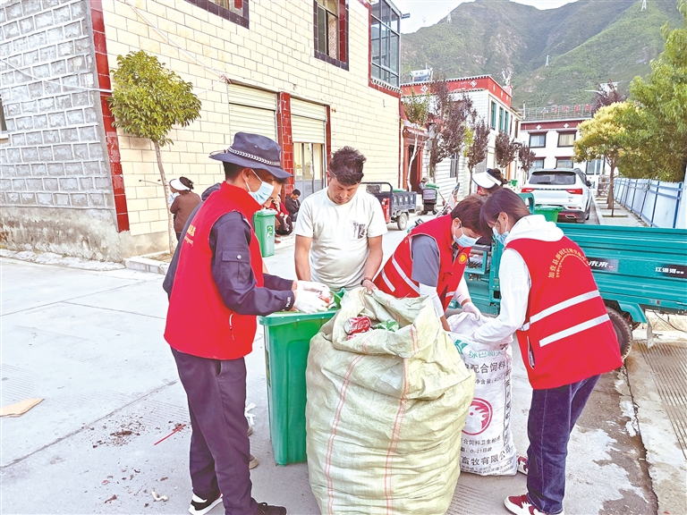 圖為塘麥村黨員在幫助村民搬運(yùn)可回收垃圾。記者 武沛濤 丹增平措 攝