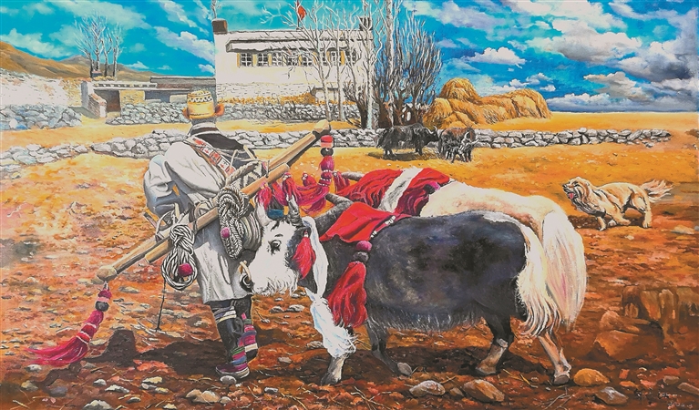 在鄒文江的畫筆下,《草原新景》展現(xiàn)的是牧民騎著摩托車放牧,藍(lán)天白云下,現(xiàn)代化的交通工具與遠(yuǎn)處的雪山相映成趣;《記憶——紀(jì)念修建川藏公路》描繪的是十八軍戰(zhàn)士修建川藏公路時(shí)的險(xiǎn)峻場景,崇山峻嶺間,奔騰不息的怒江咆哮而過,正在修路的十八軍戰(zhàn)士顯得渺小又偉大;《邊陲人家》記錄的是一戶邊境牧民家庭悠閑放牧的生活場景……他的作品中,既有圣潔的雪山、遼闊的草原、成群的牦牛,也有現(xiàn)代化的學(xué)校、醫(yī)院、民居和牧民的笑容。