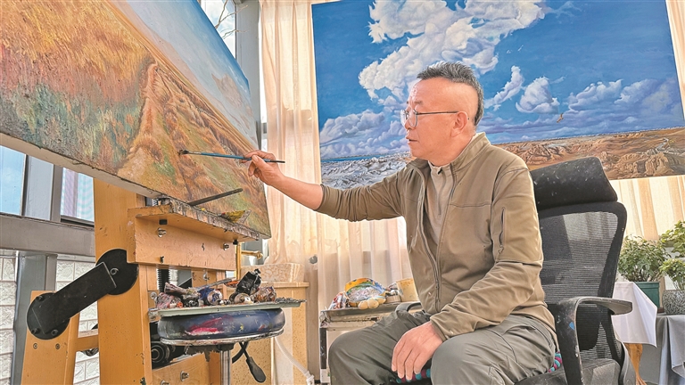 “《牧歸》是我的第一幅油畫作品,描繪的是牧民春耕回家的場景。”鄒文江指著畫室一角已經(jīng)完成的作品說道。畫面上,夕陽余暉中,牧民背著傳統(tǒng)農(nóng)具趕著牦牛緩緩歸來,遠(yuǎn)處炊煙裊裊,濃郁的生活氣息撲面而來。