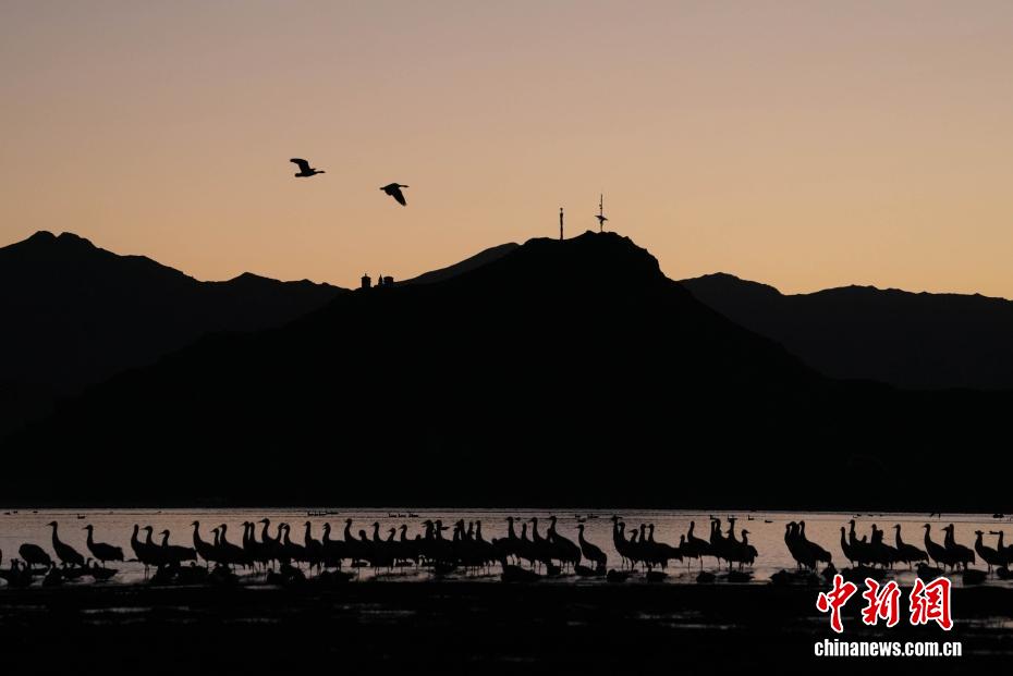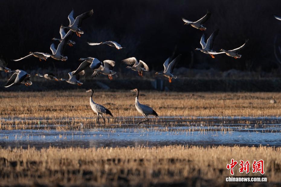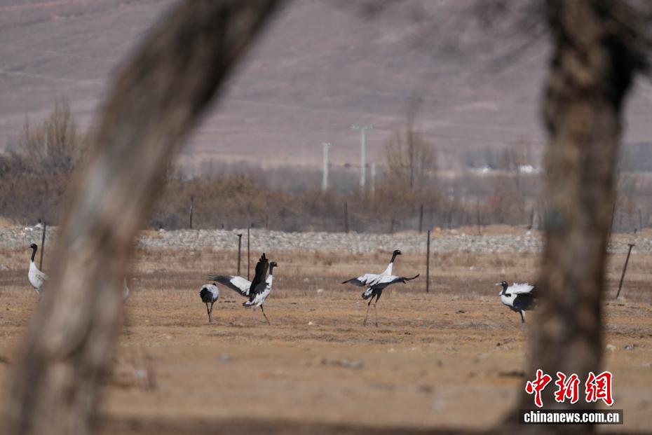 11月26日,位于西藏自治區(qū)拉薩市林周縣黑頸鶴自然保護(hù)區(qū)內(nèi),大批越冬黑頸鶴現(xiàn)身卡孜水庫(kù)及田間地頭,悠閑覓食、嬉戲。這些遠(yuǎn)道而來(lái)的黑頸鶴,將在此棲息至次年三四月份。黑頸鶴為中國(guó)國(guó)家一級(jí)保護(hù)動(dòng)物,也是唯一在高原生活、繁殖的鶴類。近年來(lái),隨著當(dāng)?shù)厣鷳B(tài)保護(hù)力度持續(xù)加大,前往林周縣越冬的黑頸鶴等候鳥數(shù)量逐年增多。圖為在林周縣卡孜水庫(kù)拍攝的黑頸鶴。貢確 攝