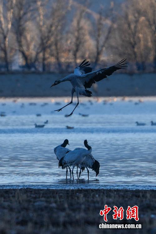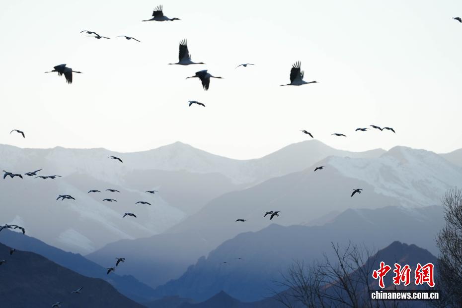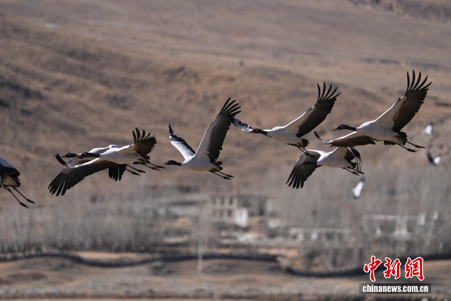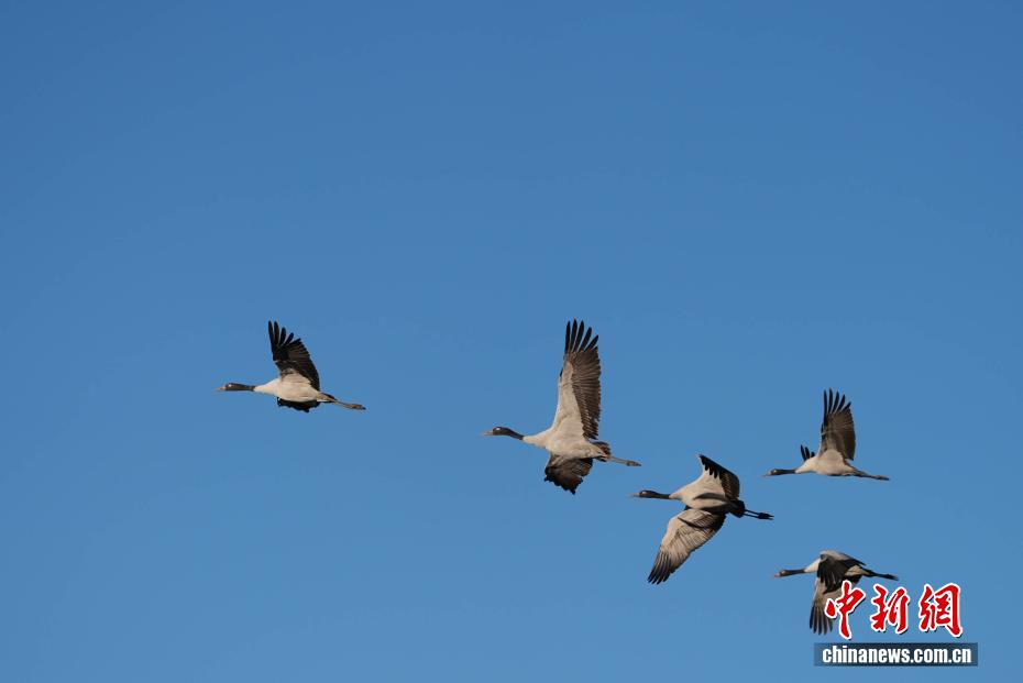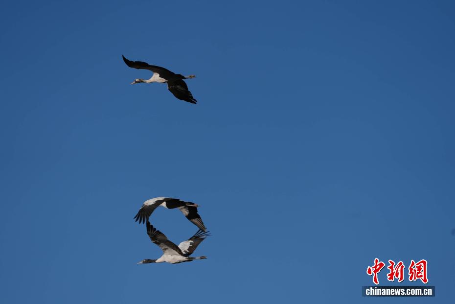 11月26日,位于西藏自治區(qū)拉薩市林周縣黑頸鶴自然保護(hù)區(qū)內(nèi),大批越冬黑頸鶴現(xiàn)身卡孜水庫(kù)及田間地頭,悠閑覓食、嬉戲。這些遠(yuǎn)道而來(lái)的黑頸鶴,將在此棲息至次年三四月份。黑頸鶴為中國(guó)國(guó)家一級(jí)保護(hù)動(dòng)物,也是唯一在高原生活、繁殖的鶴類。近年來(lái),隨著當(dāng)?shù)厣鷳B(tài)保護(hù)力度持續(xù)加大,前往林周縣越冬的黑頸鶴等候鳥數(shù)量逐年增多。圖為黑頸鶴在林周縣黑頸鶴保護(hù)區(qū)內(nèi)飛翔。貢確 攝