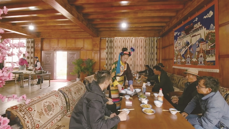 作為自治區(qū)級非遺傳承人、芒康縣“婦女致富帶頭人”的卓瑪拉姆,于2010年開辦鹽井果拉叢農(nóng)家樂,憑借著正宗的加加面風味和熱情的服務,逐漸積累了口碑。2012年,在各級政府的支持下,她采用“民族特色餐飲+鄉(xiāng)村旅游接待”的經(jīng)營模式,生意日益紅火。2017年,通過貸款300萬元、自籌160萬元翻建了農(nóng)家樂,將其升級為綜合型的民族特色餐飲店,經(jīng)營規(guī)模大幅擴大,最多時日接待游客達300余人。
