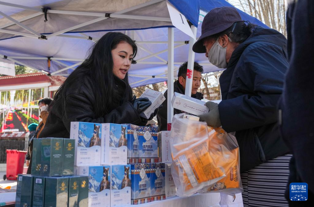12月10日,商戶(hù)在拉薩市宗角祿康公園的供銷(xiāo)大集上向顧客介紹商品。新華社記者 晉美多吉 攝