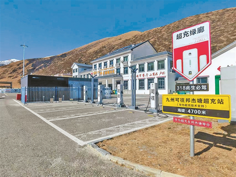 邦杰塘服務(wù)區(qū)停車場內(nèi)的新能源汽車快充樁。通訊員 張成 多吉 攝