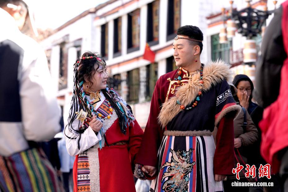 12月24日,游客在拉薩市八廓街拍攝藏服寫真。在第八輪“冬游西藏”活動持續(xù)推動下,不少游客選擇在冬季走進西藏,感受雪域高原的獨特魅力。除了免費游覽布達拉宮、羅布林卡等景區(qū),體驗藏服寫真也成為大多數(shù)游客行程中的“必選項”。中新社記者 李林 攝