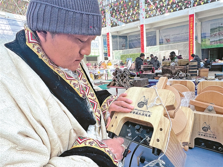 展銷(xiāo)商正在展示自己的新發(fā)明“古老藏北紡線車(chē)”。記者 萬(wàn)靖 攝
