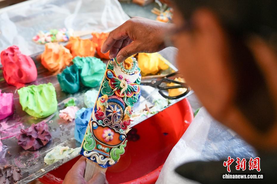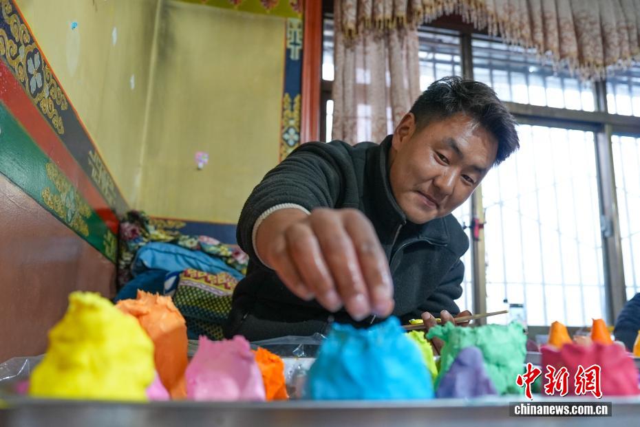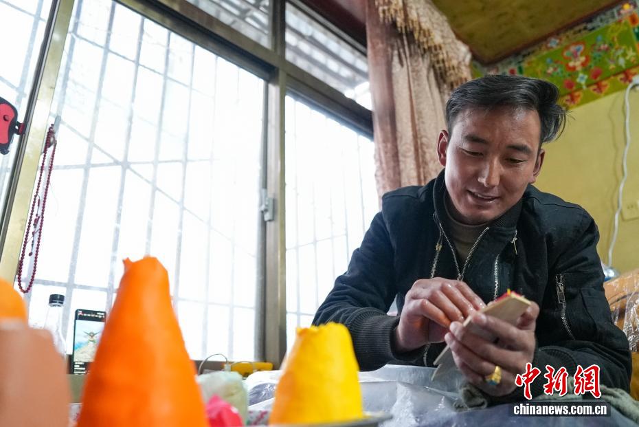 2月4日,隨著藏歷新年臨近,拉薩街頭年味漸濃,年貨市場上的“孜扎”迎來熱銷。酥油花藏語稱“孜扎”,是藏歷新年吉祥物切瑪盒的重要組件,也是藏族民眾家中必備的年貨。酥油花以酥油為主要原料,由匠人純手工捏制而成,造型涵蓋佛像、人物、花卉樹木、飛禽走獸等,常見圖案包含吉祥八寶、和諧四瑞、長壽圖等,承載著藏族民眾對新年平安吉祥、萬事順遂的美好祈愿。圖為手工藝人在制作酥油花。貢確 攝