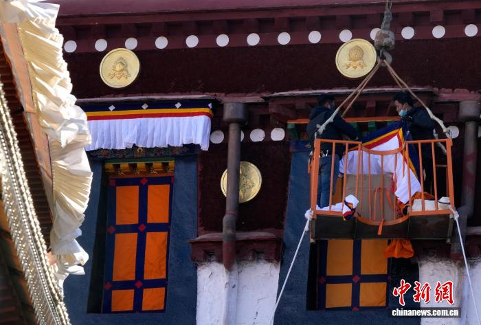 2月5日,西藏大昭寺更換“香布”,迎藏歷新年?!跋悴肌笔遣厥浇ㄖ难b飾,通常用五彩棉布縫制,主體為白色,搭配紅藍黃等色的邊沿,對窗沿等的顏料及木構(gòu)件起到保護作用。圖為工人們正乘坐吊車更換大昭寺“香布”。中新社記者 李林 攝