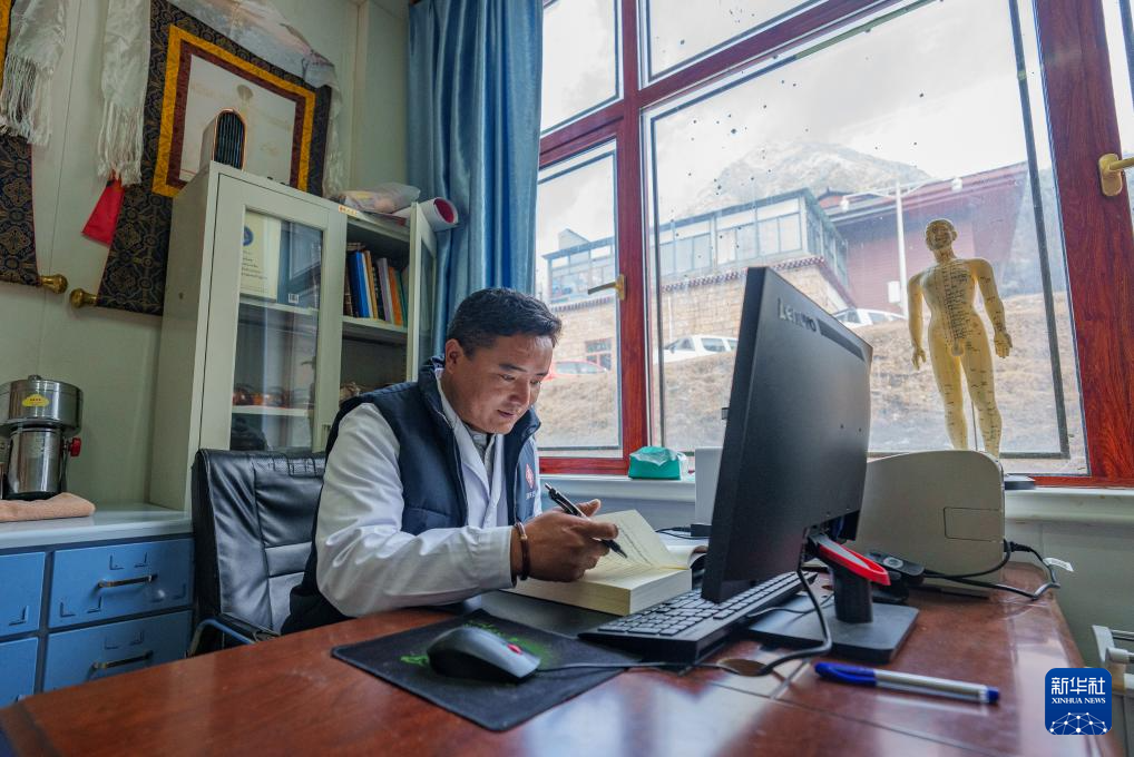 2月5日,玉麥鄉(xiāng)衛(wèi)生院醫(yī)生次旦米久在辦公室研讀藏醫(yī)書籍。新華社記者 丁增尼達 攝