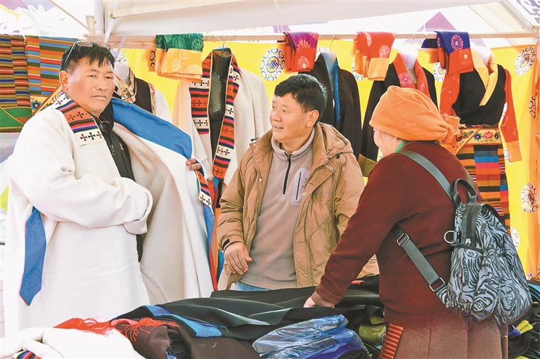 來自達(dá)孜區(qū)邦堆鄉(xiāng)的普珍阿佳,帶著自家以傳統(tǒng)方法釀制的青稞酒,吸引了不少新老主顧前來購買;“90后”創(chuàng)業(yè)者達(dá)瓦將藏式紋樣與現(xiàn)代設(shè)計相結(jié)合,制作出的新潮手機(jī)殼、帆布包,成為年輕人爭相選購的“尖貨”;書法家桌前排起長隊,他們或送春聯(lián)、或?qū)憽案!弊郑徊貞?、民歌表演的舞臺前更是掌聲不斷。