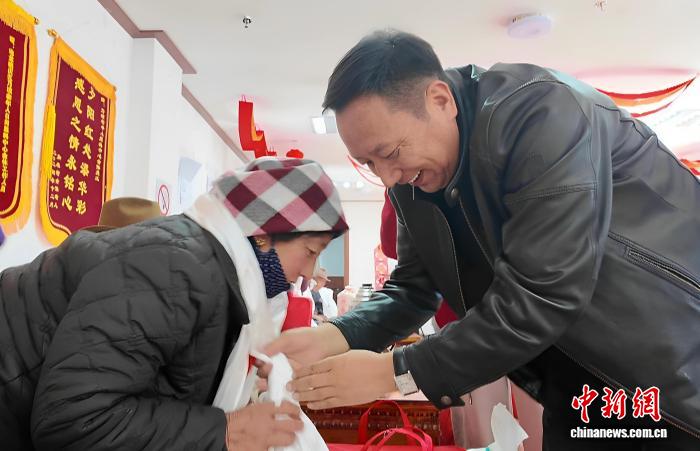 圖為西藏長壽未老社會日間照料服務(wù)中心負(fù)責(zé)人為老人獻哈達(dá)、贈慰問品。貢桑拉姆 攝
