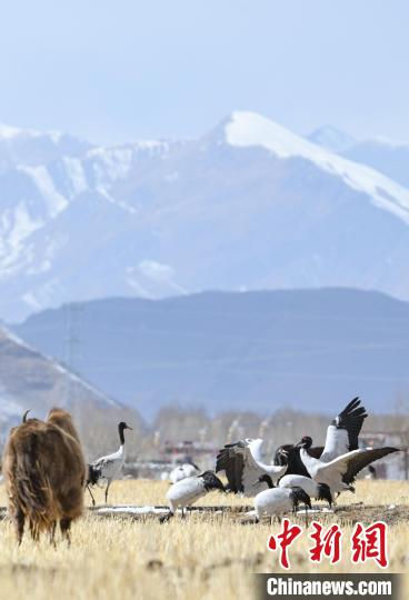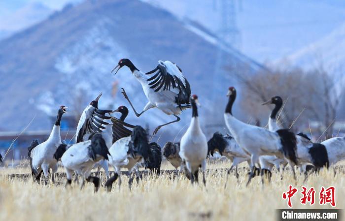圖為拉薩林周縣黑頸鶴保護(hù)區(qū)內(nèi),黑頸鶴正在覓食、嬉戲。貢嘎來(lái)松 攝