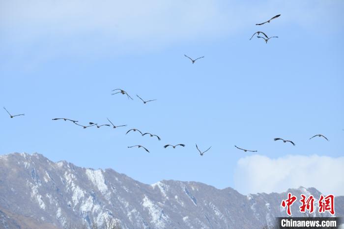 圖為拉薩林周縣黑頸鶴保護(hù)區(qū)內(nèi),黑頸鶴在雪山翱翔。貢嘎來(lái)松 攝