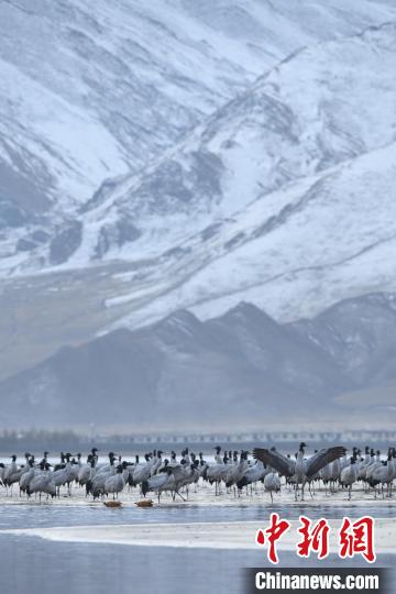 圖為拉薩林周縣虎頭山水庫(kù),黑頸鶴正在覓食、嬉戲。貢嘎來(lái)松 攝