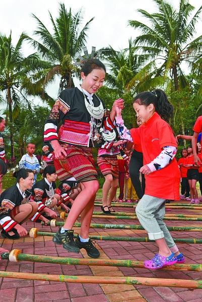 海南陵水黎族自治縣小妹村,黎族婦女和游客一同跳竹竿舞。新華社發(fā)