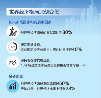 上一個百年是世界發(fā)生巨變的百年,是人類歷史上驚心動魄的百年。就世界秩序而言,最大的變動是發(fā)生了兩次世界大戰(zhàn),美國成為世界上最強大的國家,西方集團確立。還有一個變動就是俄國十月革命爆發(fā),蘇聯(lián)成為世界上第一個社會主義國家,世界社會主義興起,社會主義陣營出現(xiàn)。第二次世界大戰(zhàn)后,兩方面力量在冷戰(zhàn)中對峙了幾十年,最終以東歐劇變、蘇聯(lián)解體而結(jié)束,美國成為世界上唯一超級大國。同時,還有一個變動影響巨大,那就是民族獨立運動興起,資本主義殖民體系瓦解,發(fā)展中國家紛紛實現(xiàn)民族獨立。伴隨著經(jīng)濟全球化加速推進,不少發(fā)展中國家獲得長足發(fā)展,新興市場國家和發(fā)展中國家整體力量呈現(xiàn)上升趨勢。