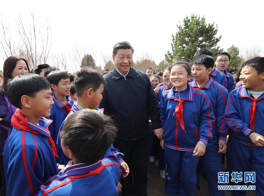 4月8日,黨和國(guó)家領(lǐng)導(dǎo)人習(xí)近平、栗戰(zhàn)書、汪洋、王滬寧、趙樂際、韓正、王岐山等來(lái)到北京市通州區(qū)永順鎮(zhèn)參加首都義務(wù)植樹活動(dòng)。這是習(xí)近平同少先隊(duì)員在一起。新華社記者鞠鵬 攝