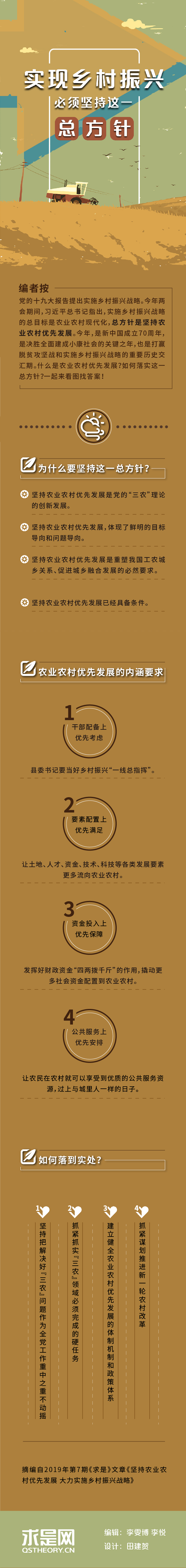 編者按:黨的十九大報告提出實施鄉(xiāng)村振興戰(zhàn)略。今年兩會期間,習近平總書記指出,實施鄉(xiāng)村振興戰(zhàn)略的總目標是農業(yè)農村現代化,總方針是堅持農業(yè)農村優(yōu)先發(fā)展。今年,是新中國成立70周年,是決勝全面建成小康社會的關鍵之年,也是打贏脫貧攻堅戰(zhàn)和實施鄉(xiāng)村振興戰(zhàn)略的重要歷史交匯期。什么是農業(yè)農村優(yōu)先發(fā)展?如何落實這一總方針?一起來看圖找答案!