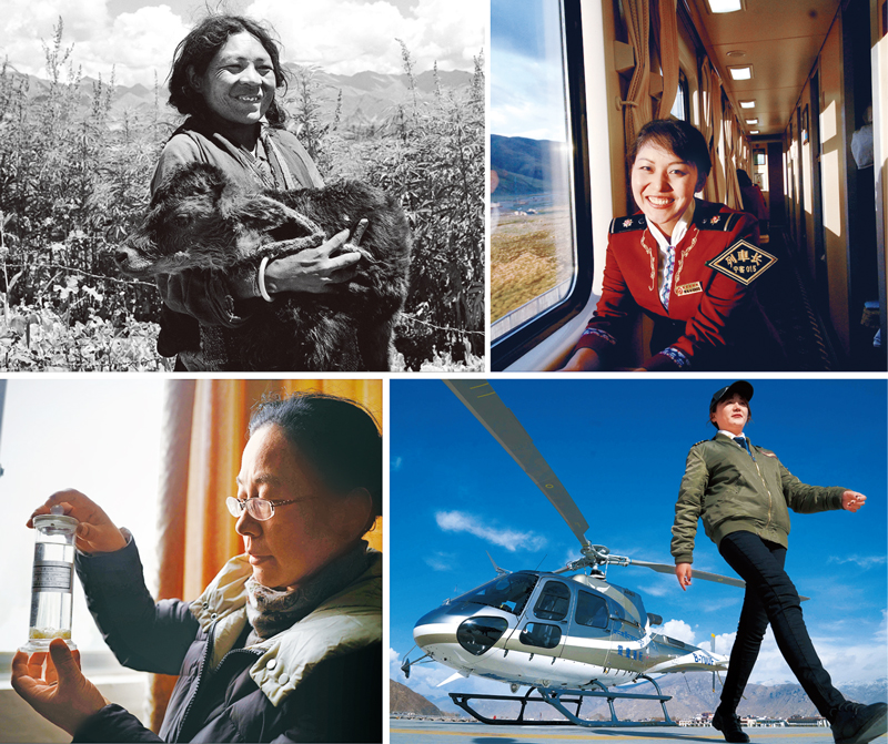 60多年來,西藏各族人民的生活條件全面改善,幸福指數(shù)大幅提升。左上圖:1959年,翻身農(nóng)奴卓瑪?shù)谝淮畏值綄儆谧约旱男∨伲ㄐ氯A社記者 李長永/攝)。左下圖:2019年2月28日,研究牦牛的藏族女博士姬秋梅在西藏自治區(qū)農(nóng)科院畜科所查看實驗樣本(新華社記者 普布扎西/攝)。右上圖:2007年9月28日,青藏鐵路線上的首位藏族女列車長索朗德吉(新華社記者 覺果/攝)。右下圖:2019年3月20日,來自當雄草原的藏族女直升機駕駛員益西(新華社記者 晉美多吉/攝)。