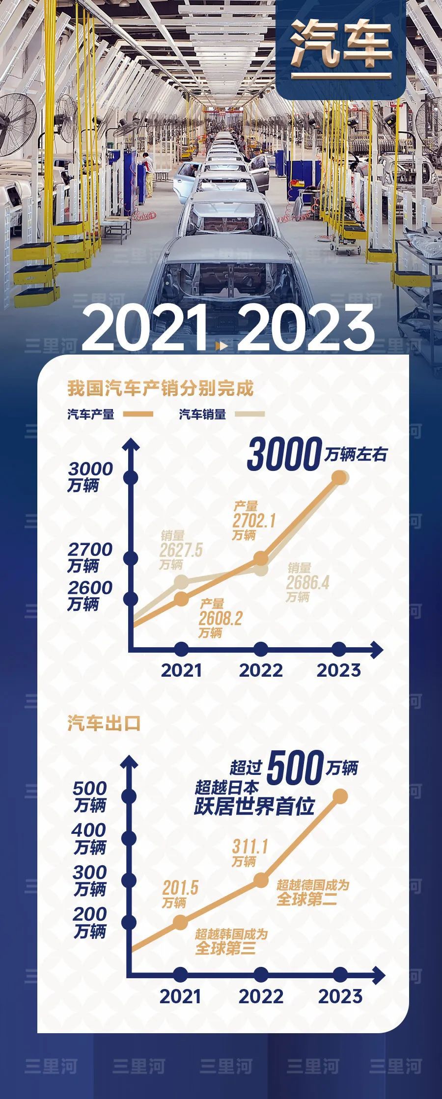 2023年,全年汽車產(chǎn)銷量預(yù)計(jì)達(dá)3000萬(wàn)輛左右、創(chuàng)歷史新高,出口超過(guò)500萬(wàn)輛,超越日本,躍居世界首位。
