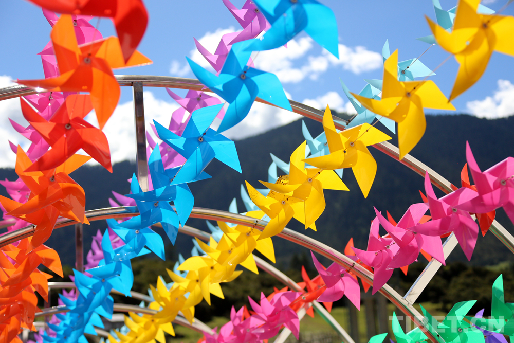 圖為魯朗小鎮(zhèn)景區(qū)旁的“網(wǎng)紅橋”上掛滿了顏色各異的風(fēng)車 攝影:王佳豪