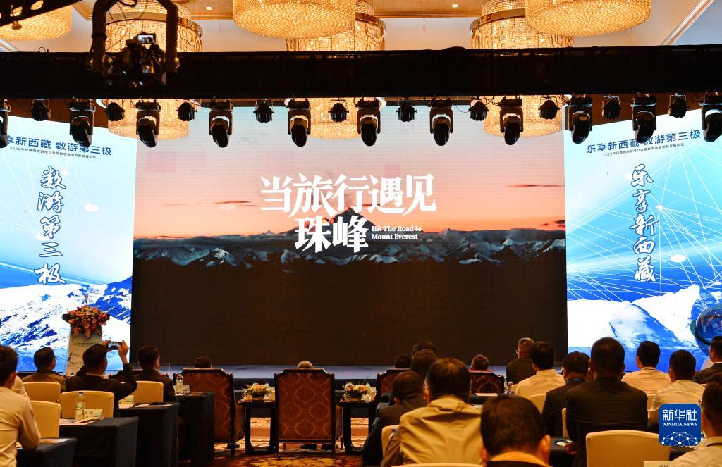 在2022年日喀則旅游推介會(huì)暨數(shù)字旅游創(chuàng)新發(fā)展論壇上播放的《當(dāng)旅行遇見珠峰》旅游微電影(7月15日攝)。新華社記者 張汝鋒 攝