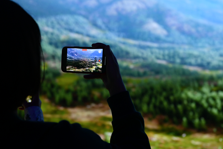 參觀者在祁連山國家公園青海片區(qū)展陳中心內(nèi)的球幕影院拍攝。