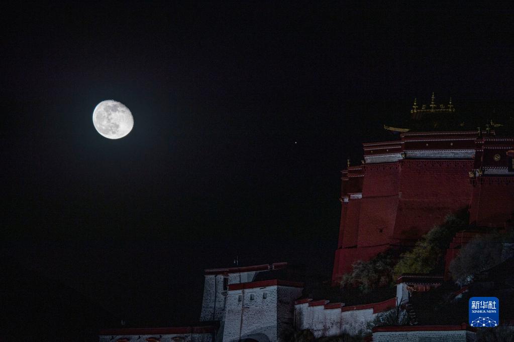 11月11日晚,一次賞心悅目的火星合月亮相天宇。這是在西藏拉薩市布達拉宮附近,記錄下的這幕“星月童話”。新華社記者 覺果 攝