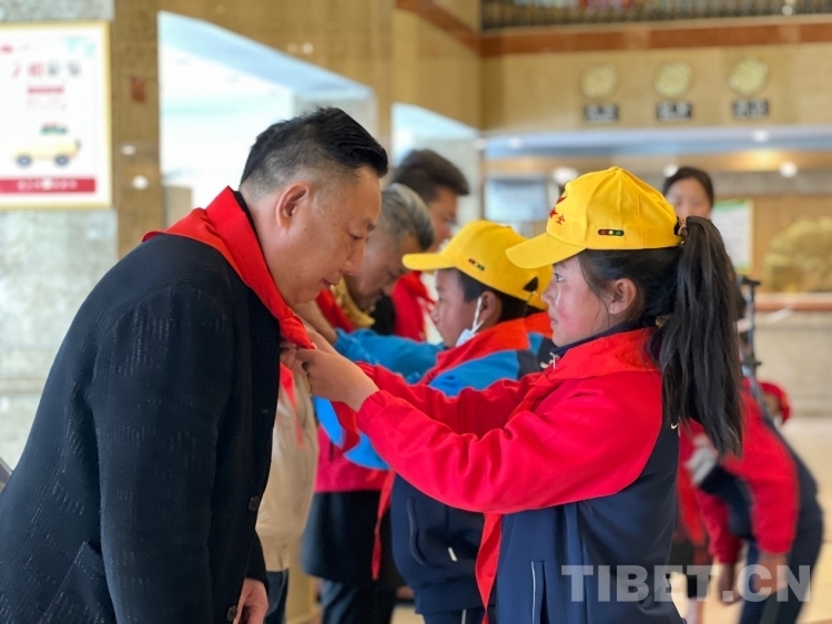圖為學生代表向相關(guān)領(lǐng)導(dǎo)佩戴紅領(lǐng)巾 攝影:德吉卓瑪